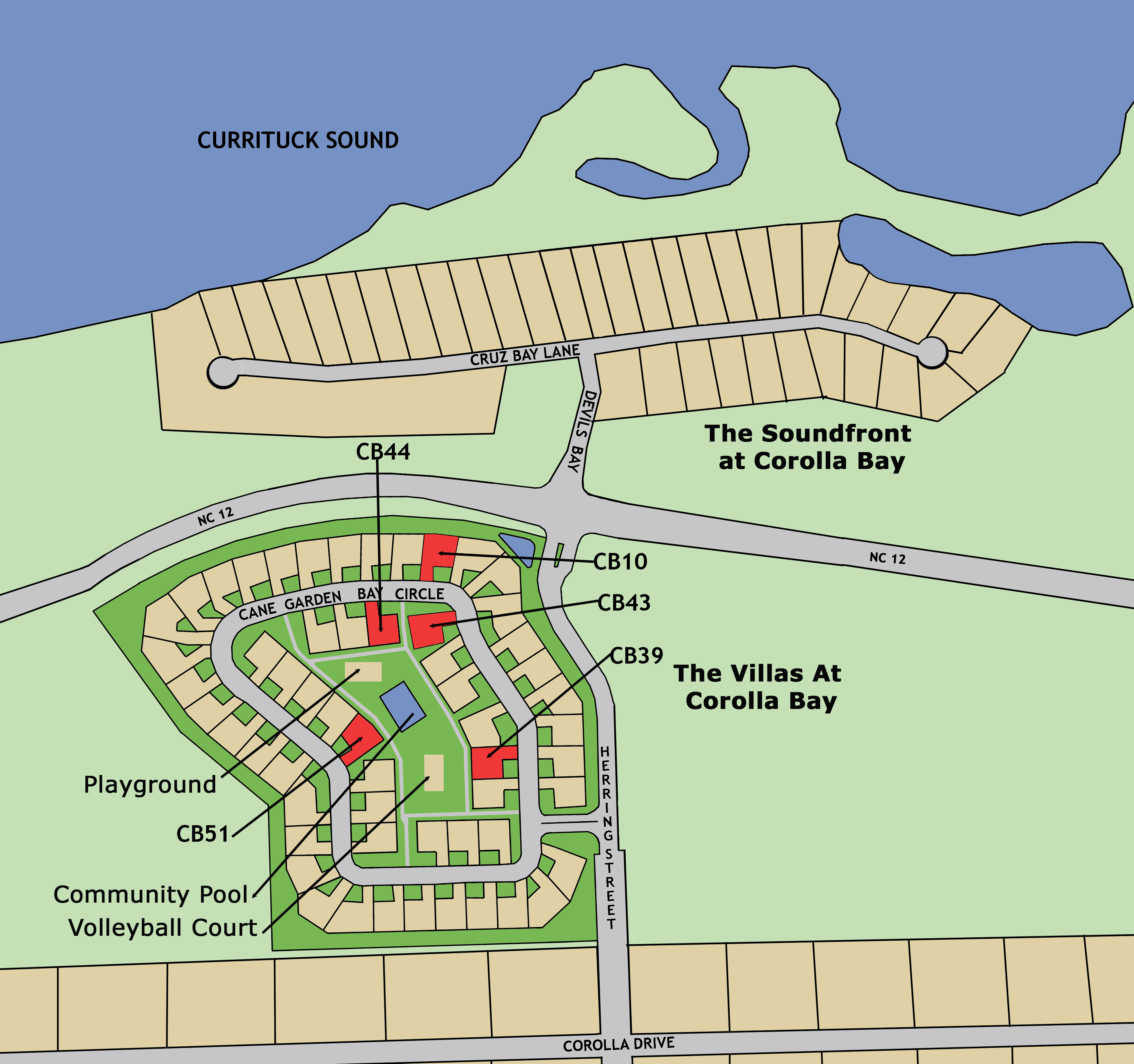 Corolla Bay is divided into 2 sections. The Soundfront at Corolla Bay and The Villas at Corolla Bay (on the Oceanside).